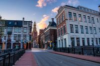 Een blik naar het centrum van de stad Groningen, met de iconische A-Kerk zichtbaar tussen de historische gebouwen aan de Brugstraat. Gefotografeerd vanaf de Lage Der A in de vroege ochtend in een nog slapende stad.