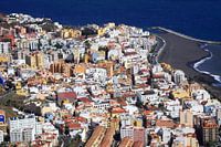 De stad Santa Cruz op de Canarische Eiland La Palma gezien vanaf een hoge berg. Eiland La Palma is net als andere Canarische Eilanden, gevormd door vulkanische activiteiten, typerend zijn ook de zwarte zandstranden. De stad Santa Cruz de la Palma is de hoofdstad van het eiland.
