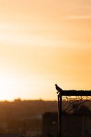 Foto van een duif, die geniet van een prachtige zonsopgang. De lucht kleurt geel en het zonlicht zorgt voor een mooi silhouet van de vogel. In de steden Fez en Marrakech vind je op de daken veel duiven, ze horen echt bij de stad. Ik vind dit een mooi sereen stads beeld met mooie heldere kleuren.