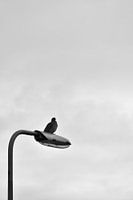 Minimalisme ten top. Een eenzame duif op een lantaarnpaal tegen een eindeloze grijze lucht. Dit zwart-wit beeld speelt met negatieve ruimte en vorm, wat zorgt voor een moderne en rustgevende uitstraling.