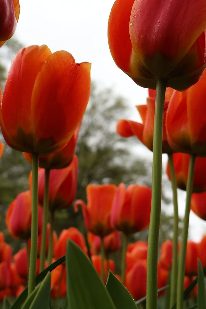 De statige Nederlandse tulp staat trots omhoog. Het lage perspectief in deze foto laat de bloemen nog groter aanvoelen.