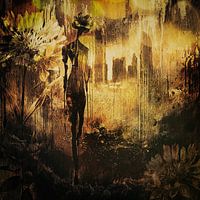 De dame die hier wegloopt, verlaat de statige bloem die links van haar staat en ook rechts op de grond ligt. Het lijkt alsof ze een hoed draagt ook in de vorm van een bloem, een elegant en chique exemplaar. De vraag is waar ze naartoe loopt. In de verte is het silhouet van een stad te zien. De wolkenkrabber rijken tot in de wolken. Wellicht is ze op weg naar een nieuwe toekomst in die grote stad in de verte. Ze loopt niet alleen richting de stad maar ook richting het mooie gouden licht. Op naar een mooie toekomst dus, die er vast net zo helder en mooi uit gaat zien als het licht waar ze naar toe loopt. Het donkere en negatieve heden laat ze vast met plezier achter zich. In dit abstracte, kleurrijke werk zijn vooral de kleuren geel, oranje, bruin en roze gebruikt en dan natuurlijk in meerdere tinten.