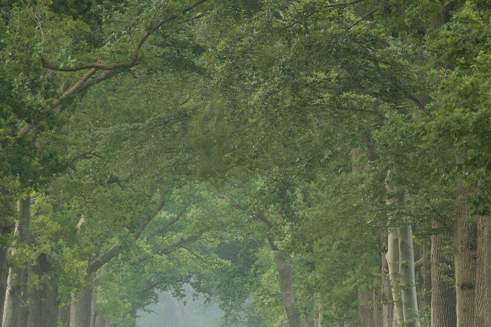 bospad in het groen. De statige bomen langs de laan maken een sfeervol beeld