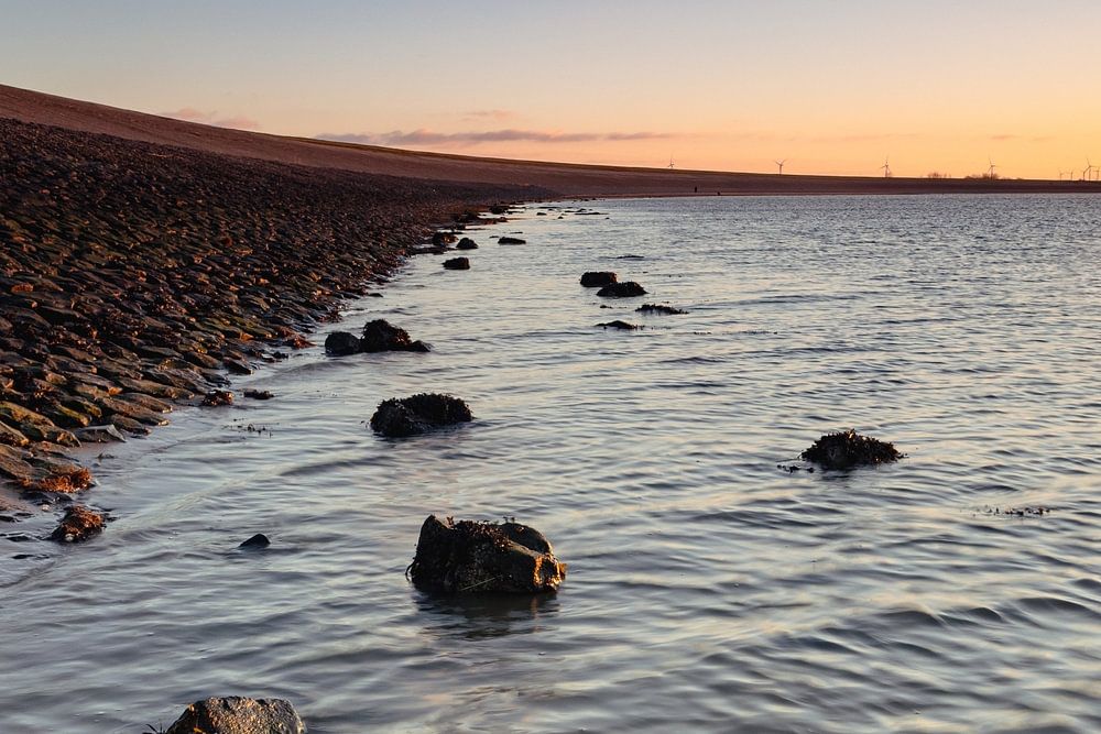 Doordat het eb aan het worden is, worden de rotsblokken op de bodem van de Waddenzee steeds meer zichtbaar.