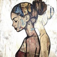 Zijaanzicht van een vrouwelijk figuur, afgebeeld in een collage-achtige stijl die traditionele portretkunst met moderne technieken combineert. De vrouw staat met gesloten ogen, wat een gevoel van innerlijke rust en introspectie oproept. De lijnen die haar omtrekken, zijn zorgvuldig getekend, maar haar silhouet is verrijkt met een mix…