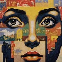 Ik sta voor mijn collage en denk na over de verschillende identiteiten en momenten die het laat zien.Aan de zijkant van de collage staat een man. Hij draagt een zwart pak en een hoed. Hij ziet eruit alsof hij hard aan het nadenken is. Hij ziet er zelfverzekerd uit, maar ook alsof hij ergens onzeker over is. Hij kijkt naar het gezicht…
