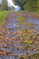 Een gouden tapijt van gevallen bladeren bedekt het pad dat diep de herfstige natuur in leidt. Stilte en warme kleuren vangen de vredige sfeer van gouden oktober.