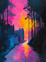 Het schilderij toont een straatbeeld met huizen in impressionistische stijl, badend in felle, vrolijke kleuren. Gevels in blauw en paars dansen in losse, levendige penseelstreken over het doek. De lucht pulseert in tinten roze en geel, terwijl de ondergrond reflecties en schaduwen weergeeft in beweging. Het geheel straalt warmte,…