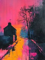 Het schilderij toont een straatbeeld in impressionistische stijl, badend in felle, vrolijke kleuren. Roze, geel en paars dansen in losse, levendige penseelstreken over het doek. De lucht pulseert in tinten oranje en roze terwijl de ondergrond reflecties en schaduwen weergeeft in beweging. Het geheel straalt warmte, speelsheid en leven…