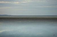 Zon, zee, zand en strand. Windstilte op een blauwgrijs wit bewolkte winterdag verstild en abstraheert het actieve strand aan de buitenkant van de Brouwersdam.
