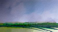'De storm arriveert' is een minimalistische aquarel schilderij van een landschap met een mooie Hollandse wolkenlucht vlak voor een onweersbui.