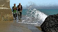 De storm is verkrijgbaar twee versies. Hier ziet u de cartoonversie van twee jongens die de golven trotseren, welke tegen de rotsen kapot slaan. Het is een hele kunst om hier je sigaretje brandend te houden.