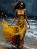 Dit impressionistische schilderij vangt de elegantie en kracht van een vrouw die in een gele jurk langs de kustlijn loopt. Haar blik is zachtjes naar beneden gericht terwijl ze haar jurk vasthoudt, en haar silhouet gaat op in het ritme van de woeste golven om haar heen. Het schilderij, in zachte pasteltinten, geeft een gevoel van diepte en beweging door de expressieve verfstreken – je ziet de dikke lagen verf die het doek tot leven brengen, met elke streek zichtbaar en tastbaar.