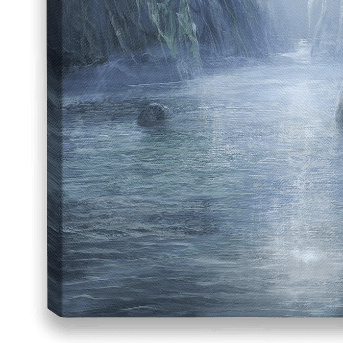 Het schilderij toont een idyllische vallei, gehuld in een nevel van licht die een sfeer creëert die zowel mystiek als echt is. Een fascinerend licht doordringt de kloof van linksboven naar rechtsonder, waardoor alleen geselecteerde gebieden gloeien met een buitenaardse uitstraling. Deze gerichte concentratie van licht geeft de foto een…