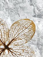 Als je inzoomt op het werk kun je mooi de gedetailleerde structuur zien van het hortensiablaadje. Daarnaast zie je dan ook mooi het contrast tussen de structuur van het blaadje en de achtergrond.