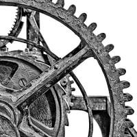 Zwartwit beeld van een antiek uurwerk mechanisme van een kerkklok