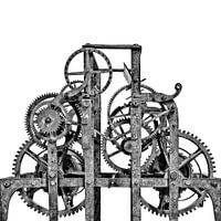 Zwartwit beeld van een antiek uurwerk mechanisme van een kerkklok