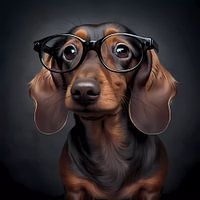 Een digitale print van een poserende teckel met een bril op straalt intelligentie en charme uit. De teckel is afgebeeld als een zelfverzekerd dier.