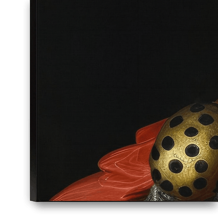 Dit kunstwerk imiteert de stijl van de oude meesters en toont een portret van een jonge vrouw in 16e-eeuwse mode. Ze draagt een elegante rode hoed en een uitbundige rode jurk. De achtergrond van de afbeelding is eenvoudig gehouden, zodat de vrouw en haar kleding centraal staan. Haar handen houden een gouden stoffen bal met zwarte…