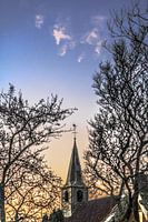 Het Friese plaatsje Paesens-Moddergat heeft een klein kerkje pal achter de Waddendijk. Op de foto in het zacht gekleurde avondlicht.
