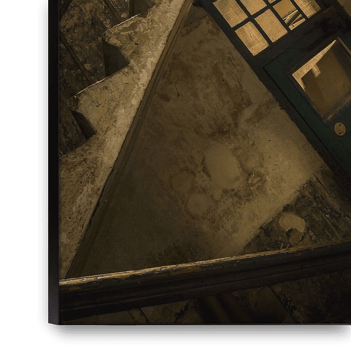 De trap af naar de donkere kelder in een oud, verlaten fabrieksgebouw