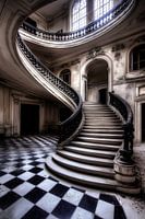 Het licht valt door hoge, gebroken ramen en werpt zachte schaduwen op de trap, terwijl de lucht zwaar is van de stilte van het verleden. Aan de muren hangen vervaagde resten behang die getuigen van een vroegere pracht en praal. De wenteltrap zelf slingert zich elegant naar boven en nodigt de kijker uit om de geheimen van de bovenverdieping te verkennen. Hier, op deze plek van verval, kun je de geesten van vervlogen tijden voelen die in elk hoekje en gaatje rondwaren, wachtend tot iemand hun verhalen opnieuw ontdekt.
