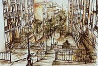 Een aquarel en pentekening geschilderd naar een eigen foto. Hier in sepia kleuren wat een beetje een nostalgische sfeer geeft.