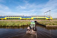 Terwijl de intercity hier bij Oostzaan voorbij raast, vaart deze boer met zijn trekker en zijn hooibalenpers door deze nauwe opening naar zijn weiland.