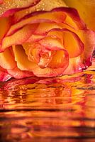 "De treurende roos" is een foto van een geel - oranje roos met een rood- roze randje met druppels, liggend in een vloeistof.