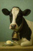 Een sfeervol en realistisch schilderij van een koe met bel, zacht van toon en met een vleugje nostalgie.