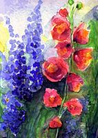 Auquarell met stokrozen en ridderspoor in een cottagetuin.
