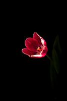 De tulp staat in een vaasje in een black box waardoor rondom de tulp de achtergrond donker is. De bloem van de tulp valt in het licht van de zon en staat achter een raam.