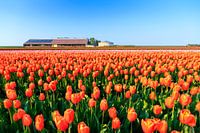 Prachtige landschaps opname van oranje tulpen in een veld in de flevopolder in Nederland in de lente met een blauwe lucht