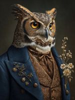 Deze betoverende compositie combineert de mystieke uitstraling van een uil met de romantische elegantie van een Victoriaanse naturalist. Het majestueuze dier draagt een diepblauwe jas met delicaat bloemenborduursel en een rijkelijk versierd bruin vest met paisleymotieven. De sierlijke nekdas en de discrete wilde bloemen die hij…