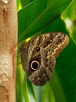 Een uilvlinder of ook wel de Caligo memnon genaamd, hangend aan een boom, de vlinder heeft prachtige vleugels met ogen van een uil.