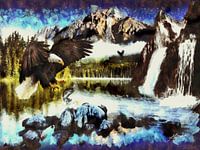 De scène legt een dynamisch moment in de wildernis vast: een adelaar reikt naar een vis in een bergmeer, omringd door ruige bergen, watervallen en naaldbomen.