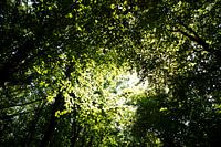 De vele bladeren van bomen in het bladerdak in Emsland, Nedersaksen, Duitsland, gefotografeerd op een warme zomerdag in augustus in een bos bij Geeste.