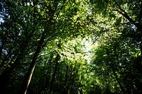 De vele bladeren van bomen in het bladerdak in Emsland, Nedersaksen, Duitsland, gefotografeerd op een warme zomerdag in augustus in een bos bij Geeste.