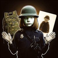 Dit beklemmende kunstwerk vangt de onschuld van de jeugd, gevangen in de machinerie van het conflict. Een kind in militair uniform heft zijn handen in stille overgave - tussen het gewicht van de rugzak van een soldaat en de spookachtige foto van zijn voormalige ik. De spanning tussen heden en verleden, spel en plicht, onschuld en verlies straalt door de scène en biedt een beklemmende meditatie over identiteit en verdwijning.