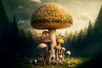 Een plaatje als uit een mooie droom. Een fantastische sprookjesachtige surrealistische paddenstoelcompositie als uit een verhalenboek en voor een verhalenboek. Ook geschikt als muurschildering of fotobehang voor een kinderkamer.