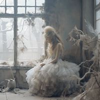 In een vervallen kamer, doordrenkt van vergetelheid en verval, wacht een eenzame bruid met een gebroken hart op de belofte van eeuwige liefde. Haar ogen weerspiegelen verloren hoop en machteloosheid, terwijl de pracht van haar trouwjurk scherp contrasteert met de vergane schoonheid van de kamer. Het stof en de verwaarlozing lijken te strijden met de ooit zo stralende dromen van geluk. Ze staat als een tragisch symbool van onvervulde liefde en verloren idealen, gevangen in de tijd en omringd door de wrange herinneringen aan een belofte die nooit is nagekomen.