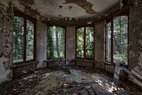 De foto is gemaakt in een verlaten villa ergens in België. De ramen in de woonkamer zijn allemaal kapot en hebben uitzicht op een bos. Doordat je naar buiten kan kijken heeft de foto meer diepte en daardoor komt de foto extra mooi uit als schilderij op een muur.