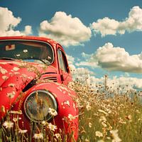 Een oude volkswagen Kever, verlaten en achtergebleven in een veld met bloemen.