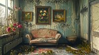 In de verlaten woonkamer groeien de struiken door heet raam naar binnen.