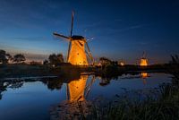 De molens van de UNESCO World Heritage site Kinderdijk tijdens de eerste week van september, de enige week in het jaar dat de molens tijdens de avonduren verlicht worden.