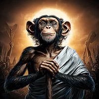 The Enlightened Primate" is een indrukwekkende samensmelting van evolutie, spiritualiteit en rebellie en toont een serene, wijze chimpansee gehuld in een sjaal, staand voor een stralende halo terwijl zijn volgelingen zich achter hem verzamelen. Dit beeld legt het moment van ontwaken vast - wanneer instinct en bewustzijn elkaar ontmoeten en leiderschap de grenzen van de soort overstijgt.