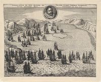 De gravure toont de verovering van de Spaanse zilveren vloot in de baai van Matanzas door een Nederlandse vloot onder bevel van Piet Hein.