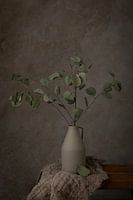 Deze foto toont een verstilde compositie waarin eenvoud en rust centraal staan. In het midden staat een matte, aardewerken kruik in een zachte, neutrale tint. Uit de kruik rijzen enkele fijne takken met ronde, grijsgroene bladeren, die losjes en natuurlijk uiteenwaaieren. De bladeren ogen kwetsbaar en licht gedroogd, wat een gevoel van…