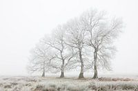 Een prachtig gezicht; de vier winterse bomen bij Grolloo in het Drentse natuurgebied. Op een koude morgen ben ik al vroeg in het veld om de berijpte wereld vast te leggen. Het is overal wit om me heen. Deze boomgroep triggert me vooral in de winter omdat het dan lijkt alsof de bomen in een rijtje achter elkaar aan marcheren door het veld. Als het blad weer aan de bomen komt is dat weer voorbij. De grassen knisperen en kraken onder mijn schoenen, een valk vliegt op uit de kleinste boom. Maar ook zonder valk op de foto ben ik een tevreden mens deze morgen.