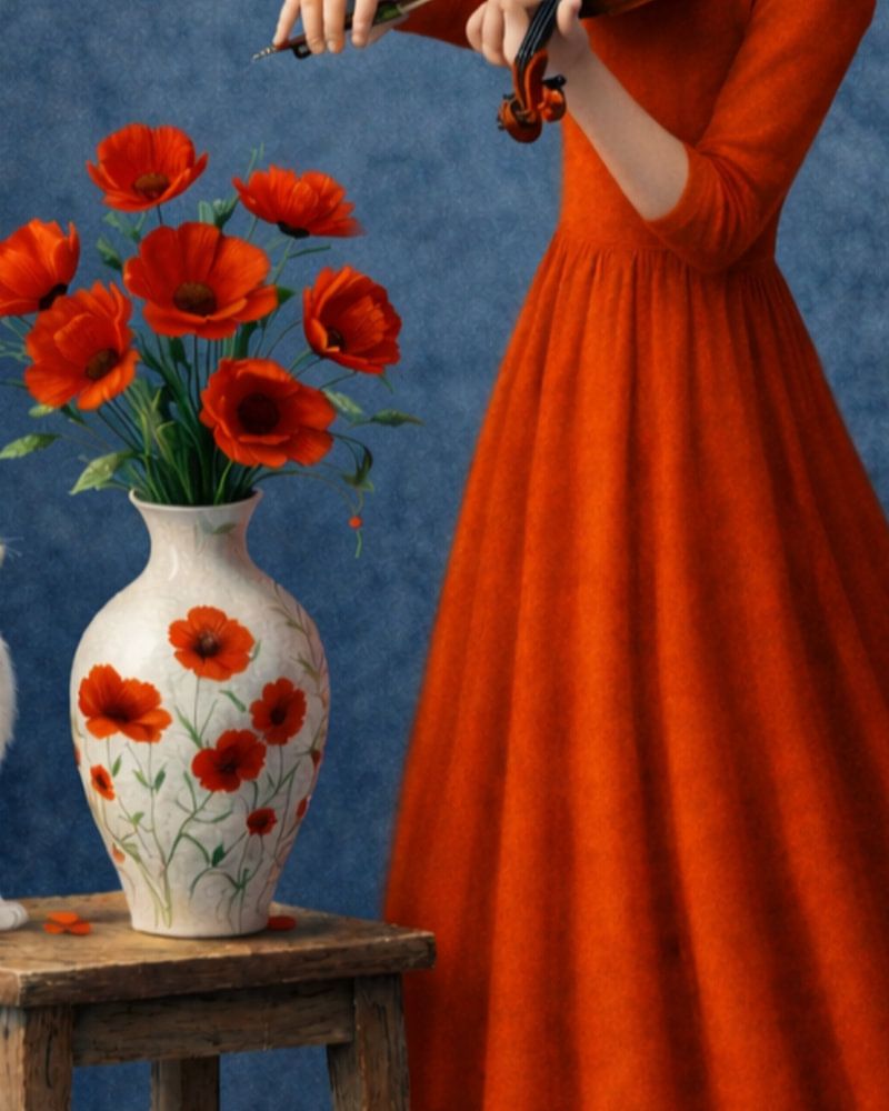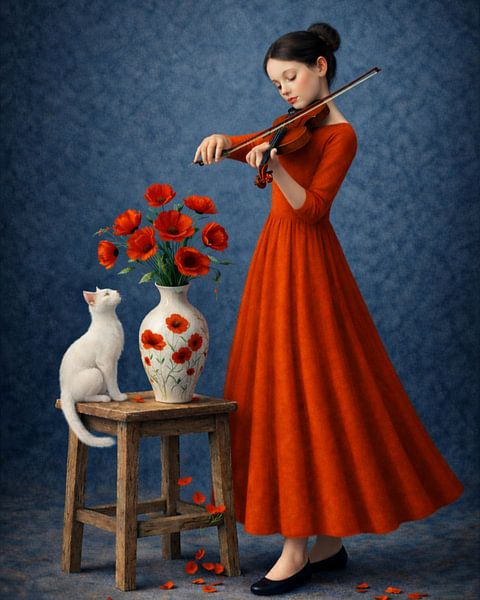 Ze streelt de stilte met zachte handen, elke noot een tedere pijn. Maar tussen gevallen bloemblaadjes en langere schaduwen een zwak licht opkomen— de toekomst zacht ademend door haar ononderbroken lied.